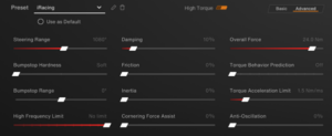 Formula racing is a very different genre. The cars rely heavily on downforce and carry a lot of speed through the corners. That’s why the FFB settings vary more compared to the two other sports car settings.