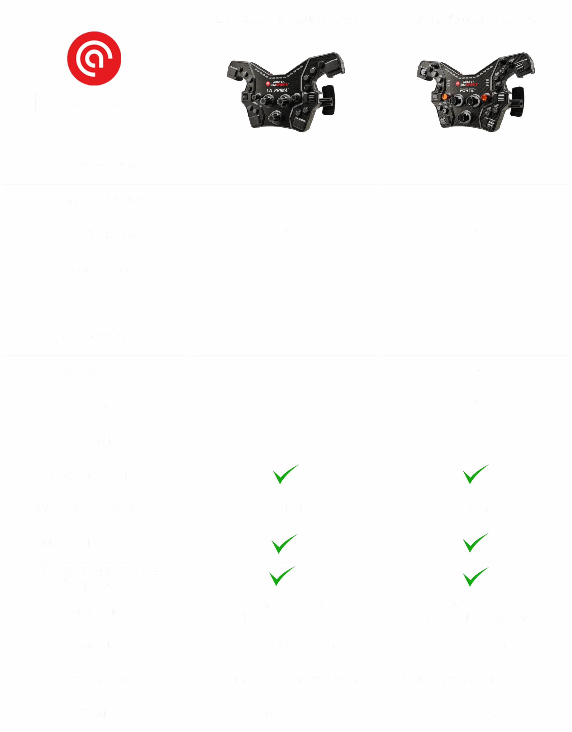 Inspired by real-life Formula and LMP cars, the La Prima™ Formula button box is based on an injection molded chassis featuring a carbon, glass and plastic composite material allied to a metal spider interface for a stiff, non-flexing wheel, which allows the user to change or upgrade the handles for maximum customization.